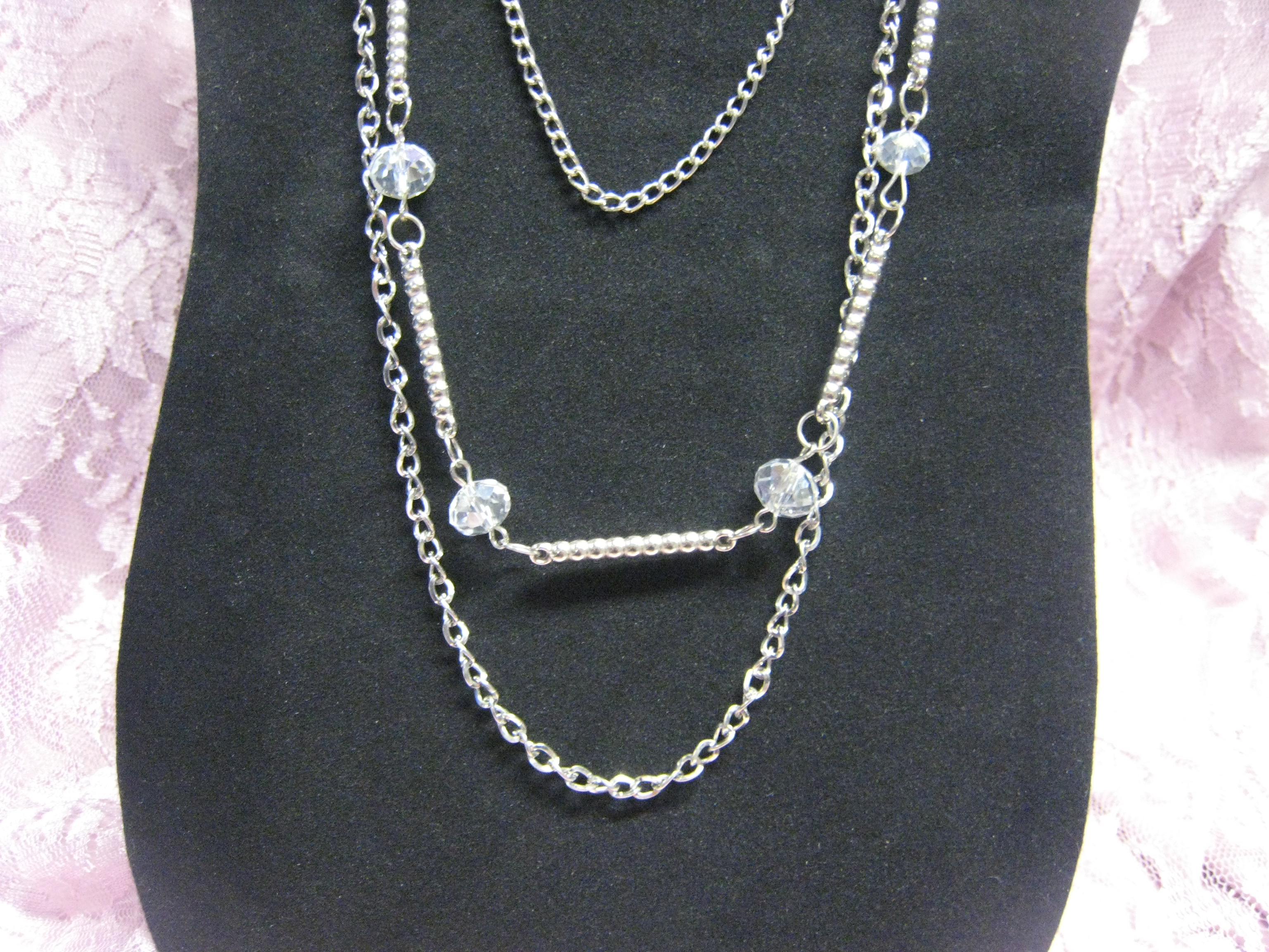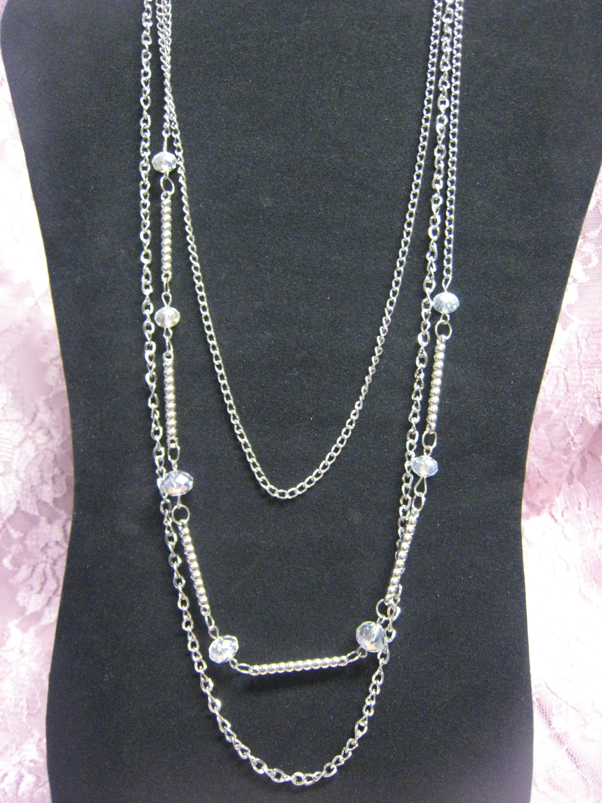 1 Long chain, 1 medium chain with metal seed beads and crystal beads and 1 shorter chain make up this beautiful necklace measuring 26". Finished with a lobster claw clasp and a 2" extender.
