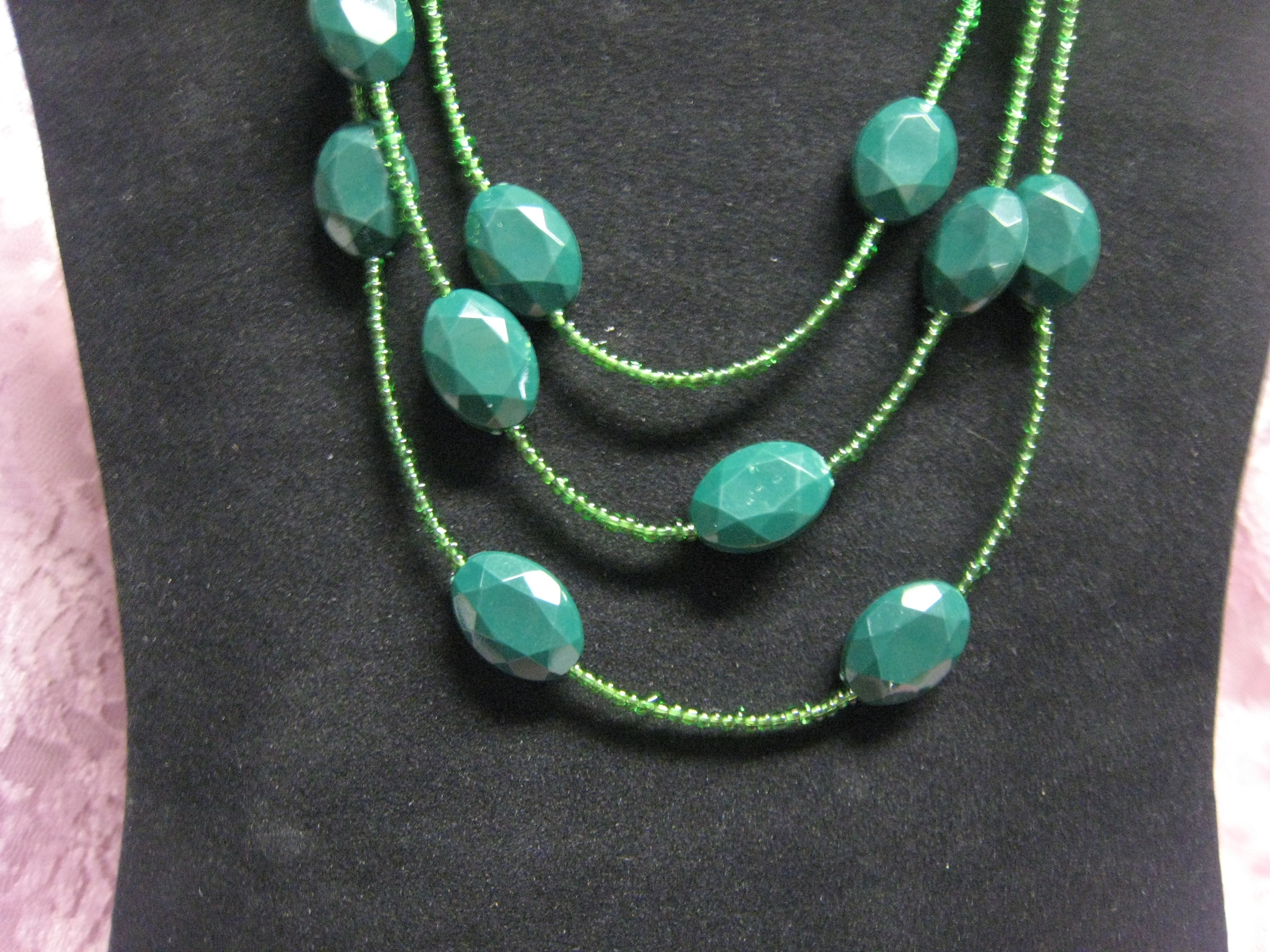 Easy to coordinate forrest green acrylic triple strand necklace. Larger beads measure 20x10mm with 1mm seed beads, Necklace measures 20"L with 3"extender.