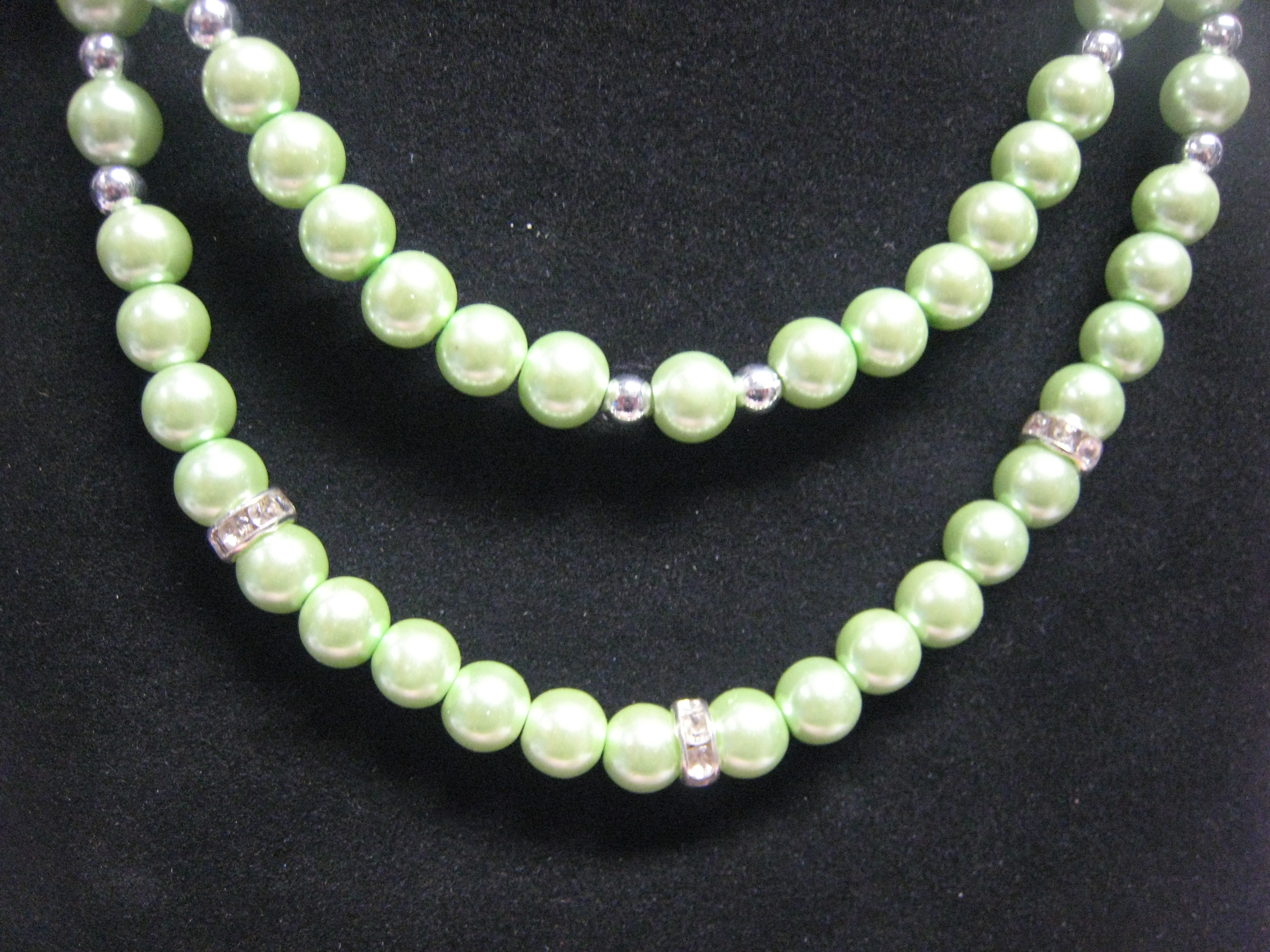 This beautiful double look necklace is made out of Cultura glass pearls with silver spacer beads and crystal encrusted rondelle beads. The necklace measures 18" long with a lobster claw clasp and has a 2" extender.