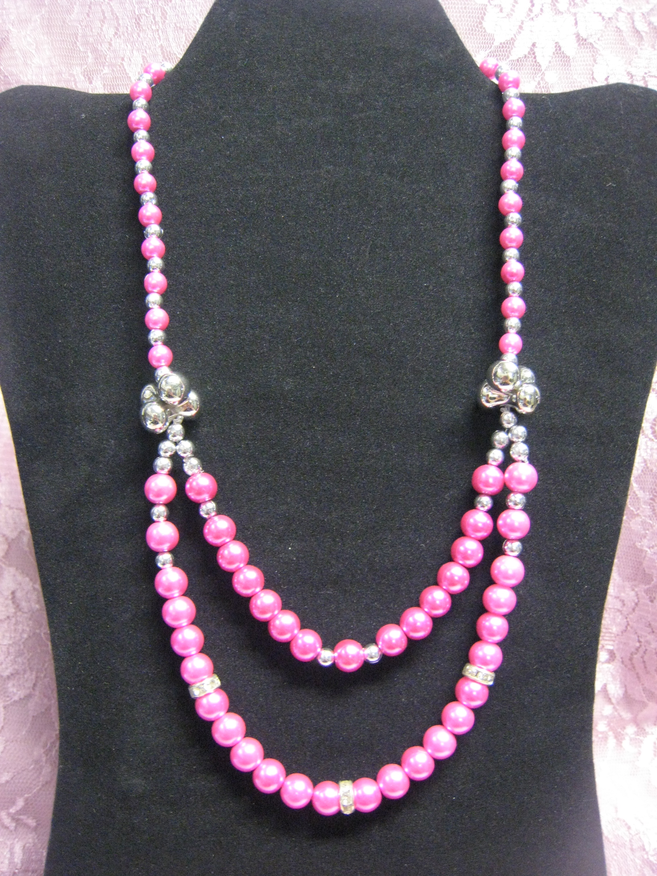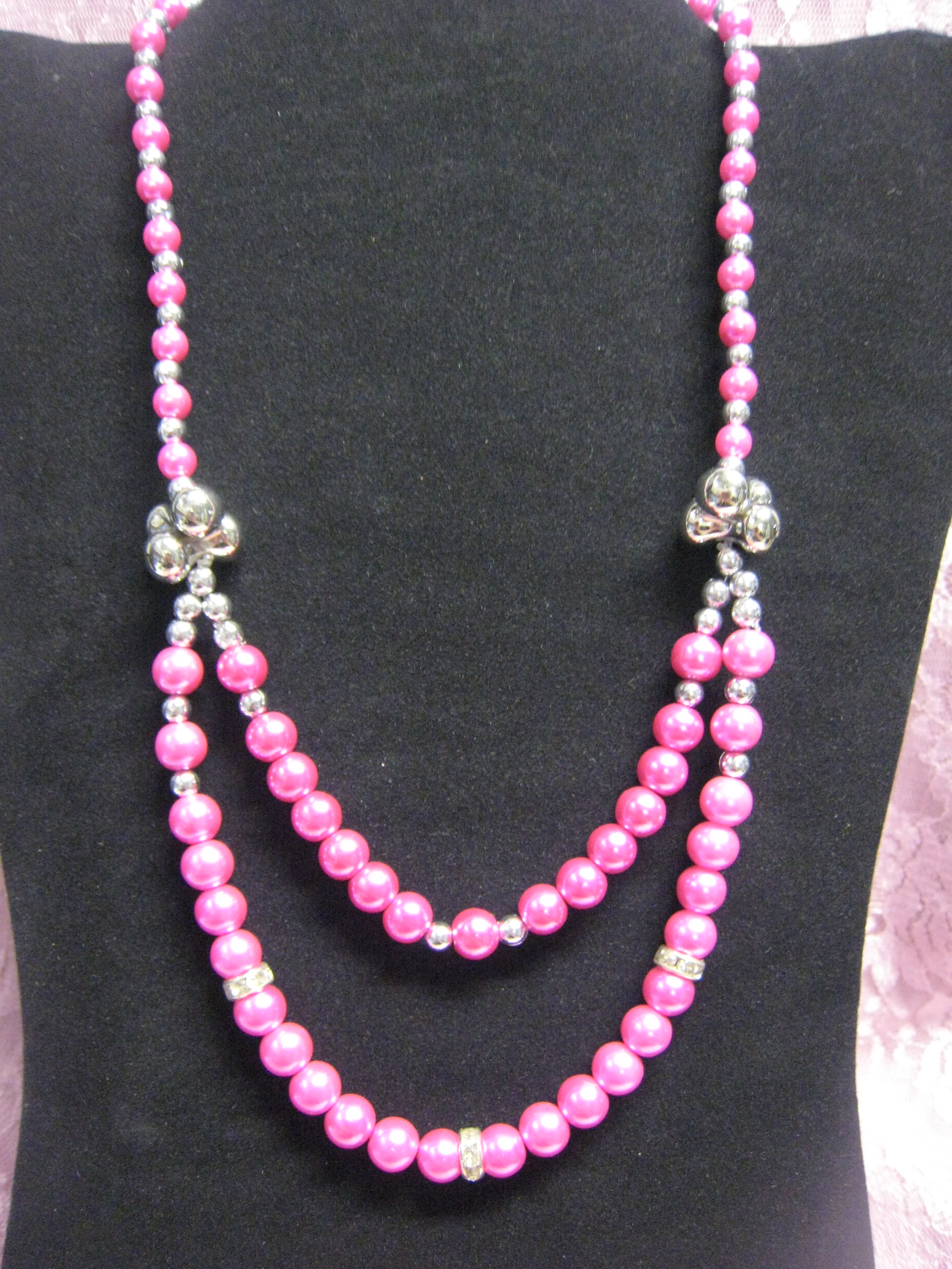 This beautiful double look necklace is made out of Cultura glass pearls with silver spacer beads and crystal encrusted rondelle beads. The necklace measures 18" long with a lobster claw clasp and has a 2" extender.