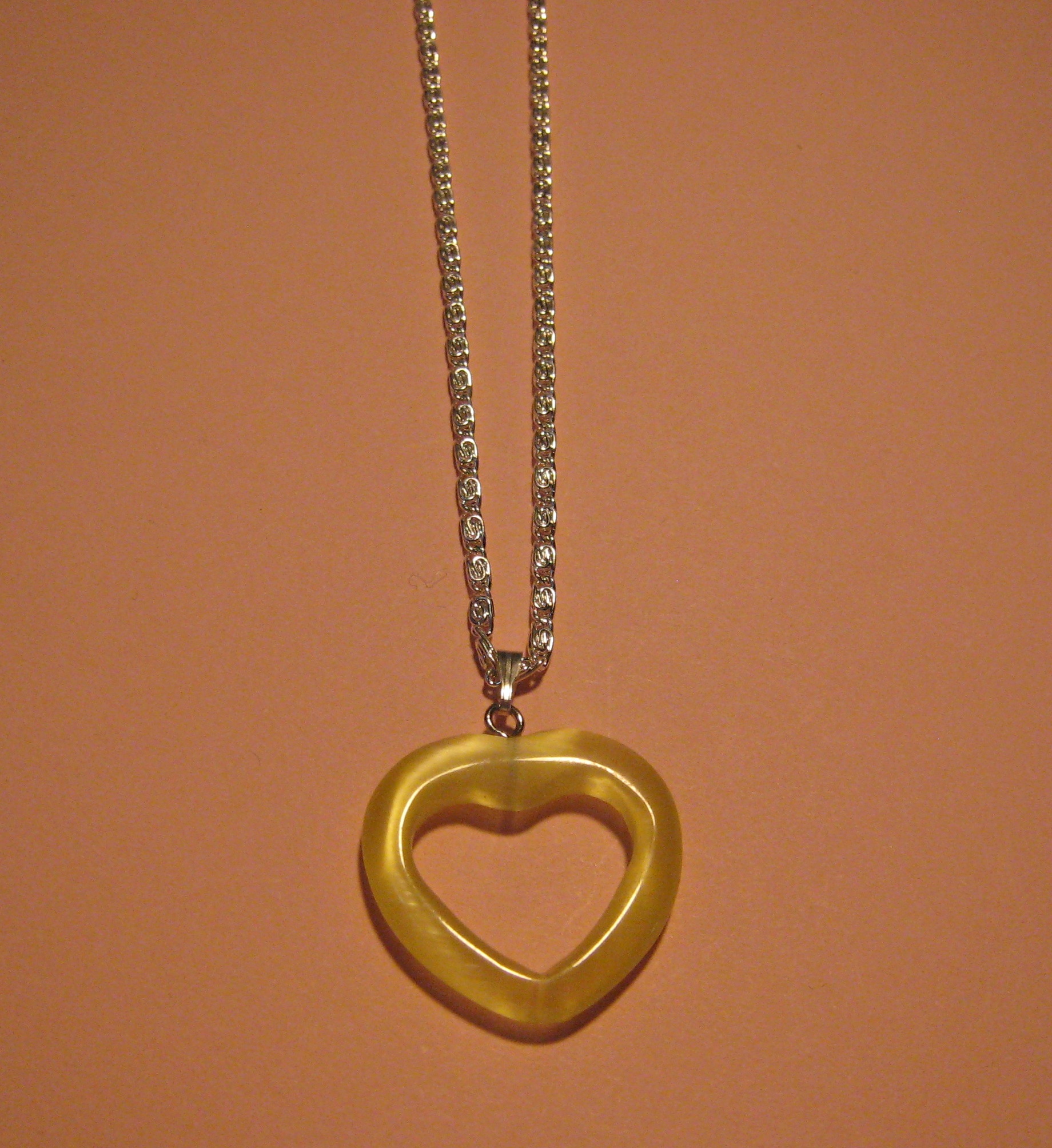 14x14mm hollow glass heart on a silver plated 16" chain.