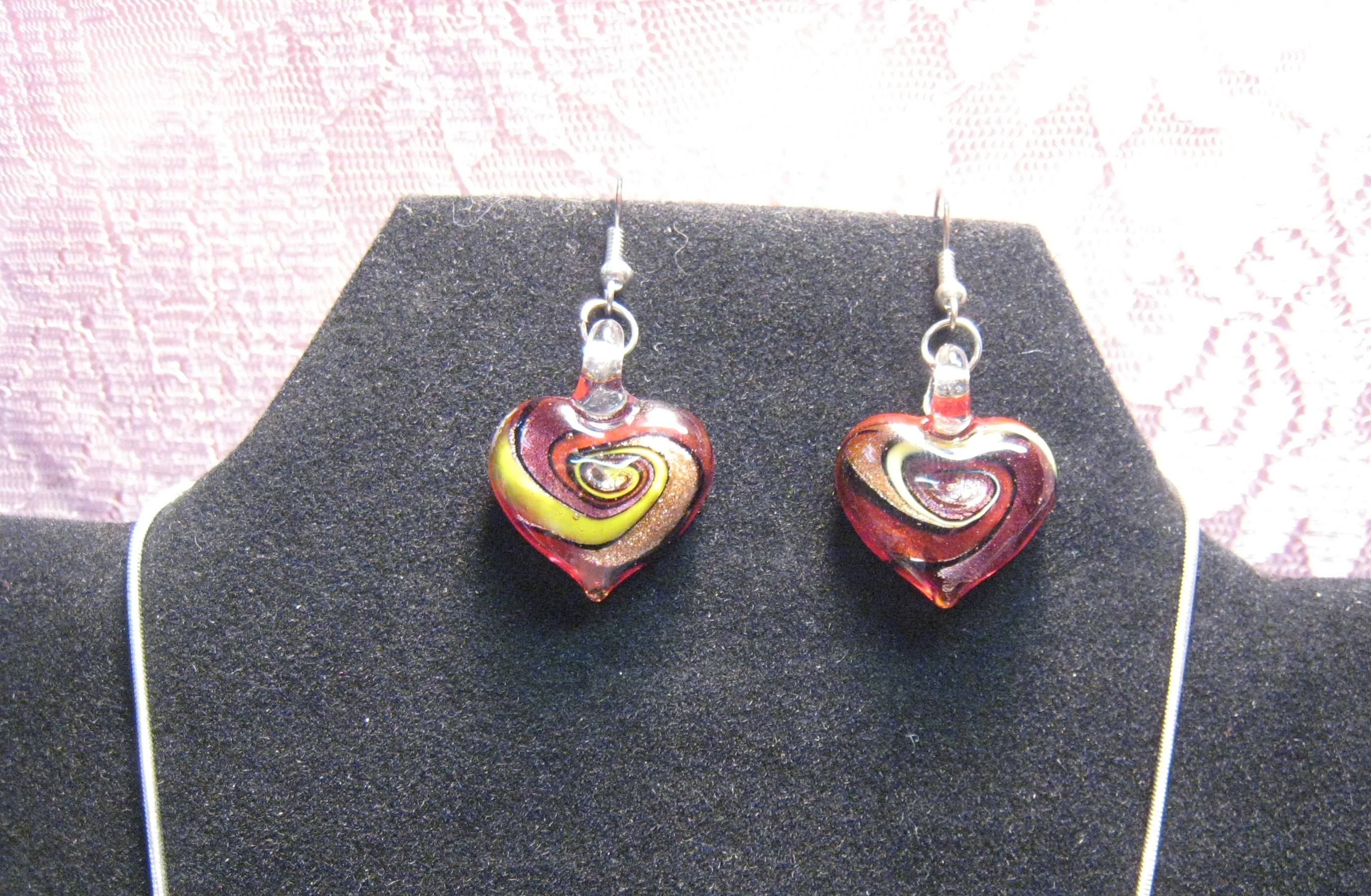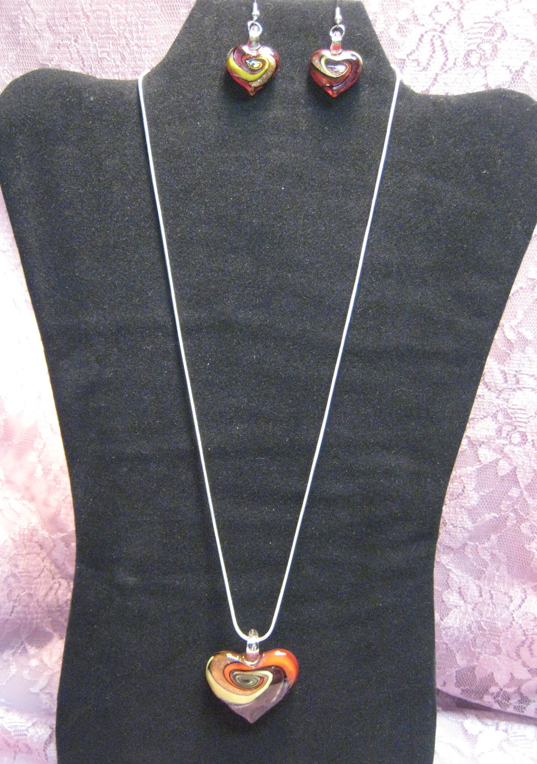 Lampworked swirl glass heart earrings and necklace charm on a 18" Sterling Silver Chain.