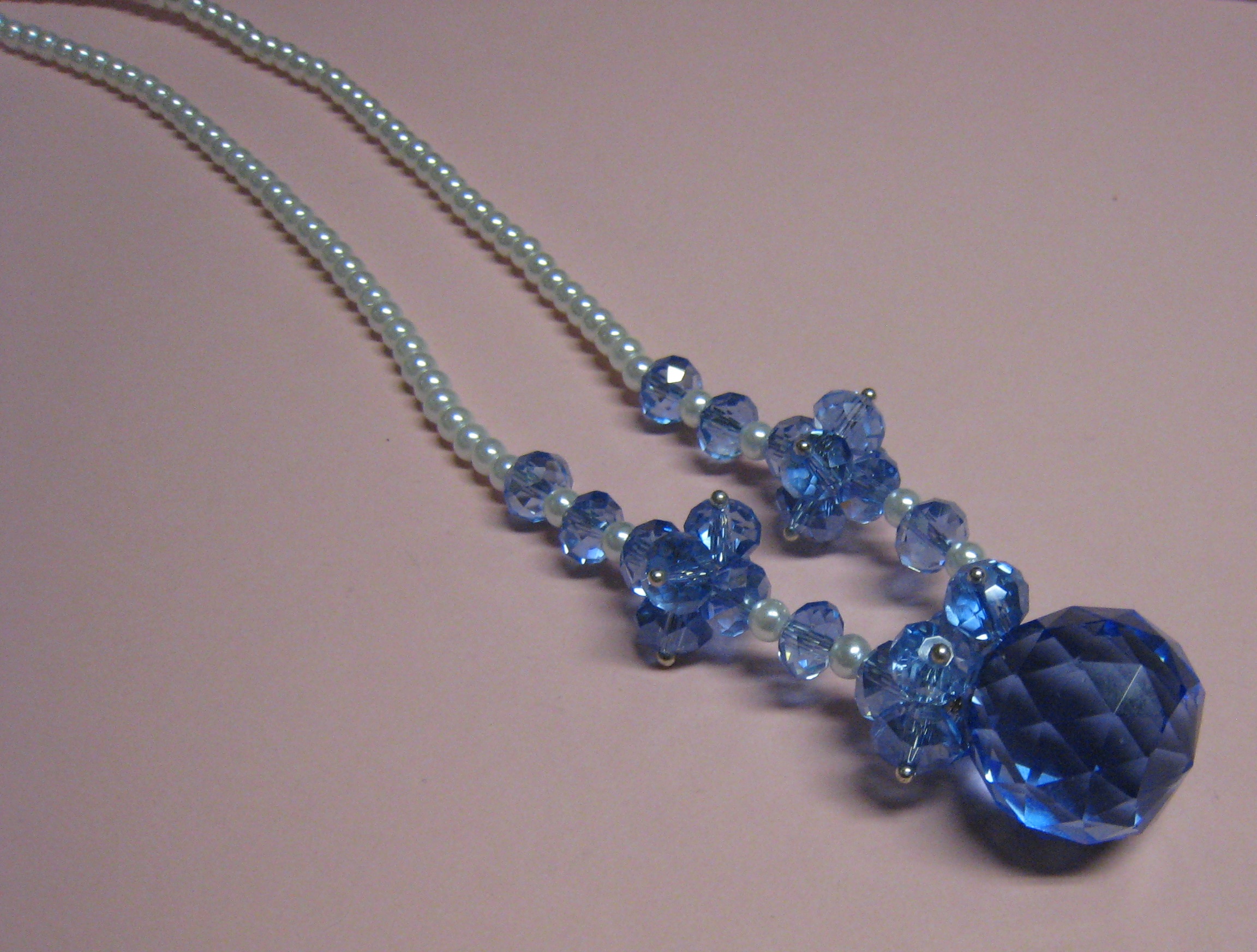 Assorted size crystals, glass pearl beads and a large inch in diameter crystal glass dangle makes up this 16" necklace.