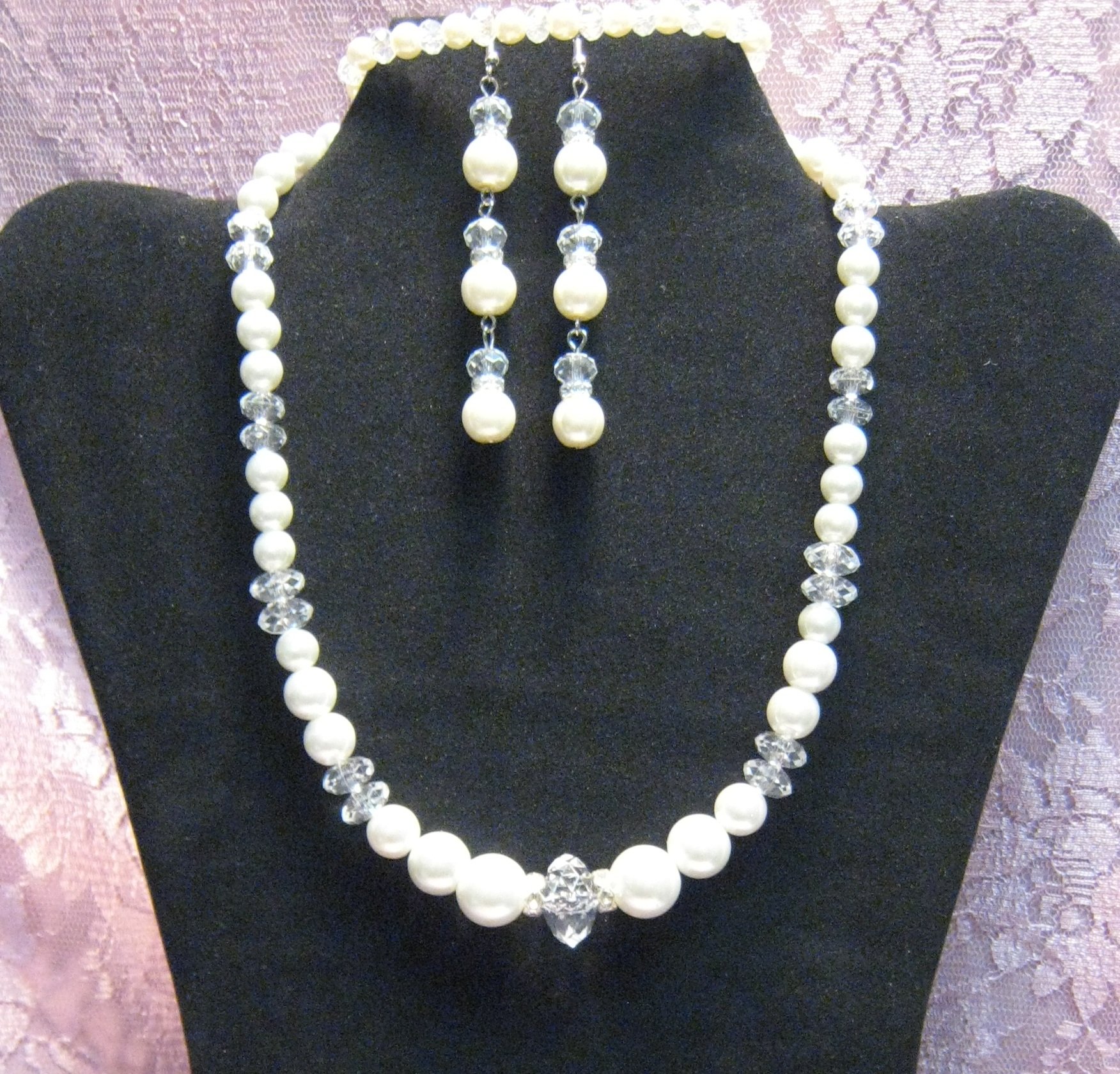 Strung Cultura glass pearls with crystals and rhinestone encrusted rondelle beads make up this beautiful piece.